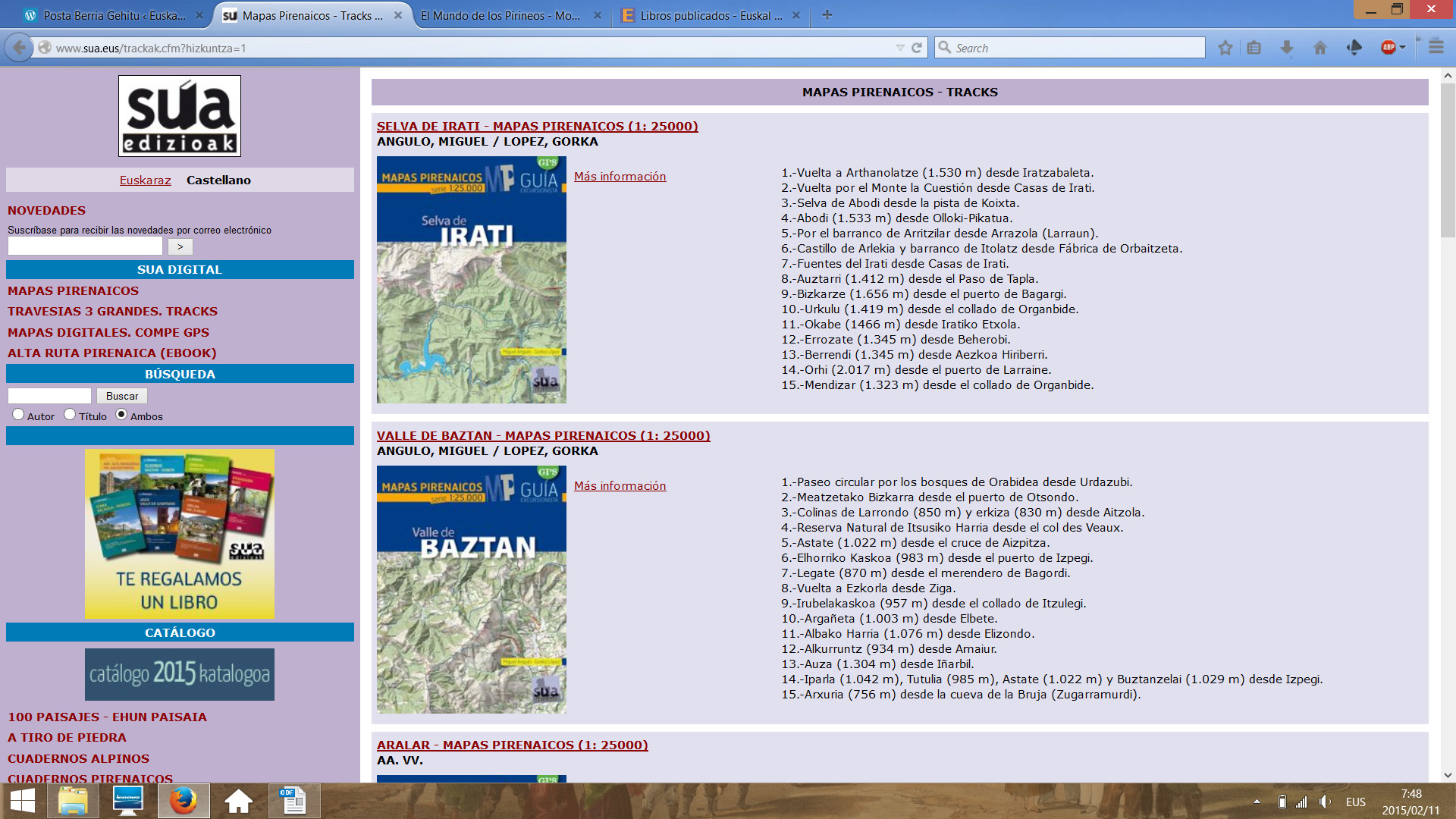 Bajo el epígrafe ‘Sua digital’ se despliegan cuatro opciones. La primera da acceso a los tracks de todos los recorridos plasmados en los nuevos títulos de la colección Mapas Pirenaicos. Los tracks se pueden descargar desde ahí de forma gratuita. Se trata de recorridos diseñados para Sua por el montañero especializado Gorka Lopez.